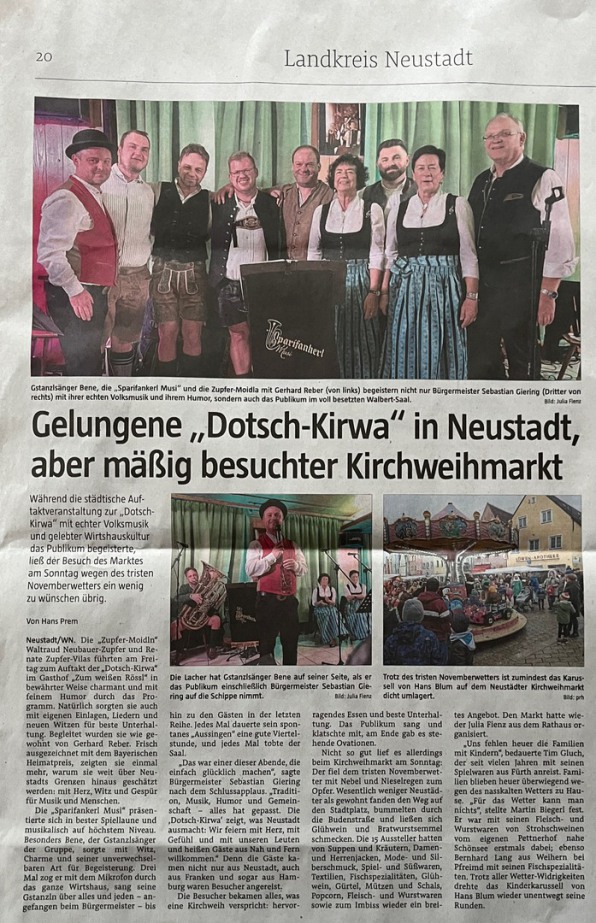 Es war echt wieder ein Kirchweihauftakt nach Maß: hervorragende Musikanten wie die Vöichtacher Rucksack-Musi und die Pfiffign Knepf, der Coupletsänger Franz Maier in seiner unnachahmlichen trockenen Art, wir, die Zupfer-Moidln mit unserem musikalischen Begleiter Gerhard, ein gut aufgelegtes Publikum, der singende Bürgermeister Sebastian Dippold und natürlich unsere jüngsten Fans Kilian, Paula, Luis und Melissa, die bis zum Schluss ausgehalten haben und mit uns "Oh Kirwa lou niat nou" gesungen haben.