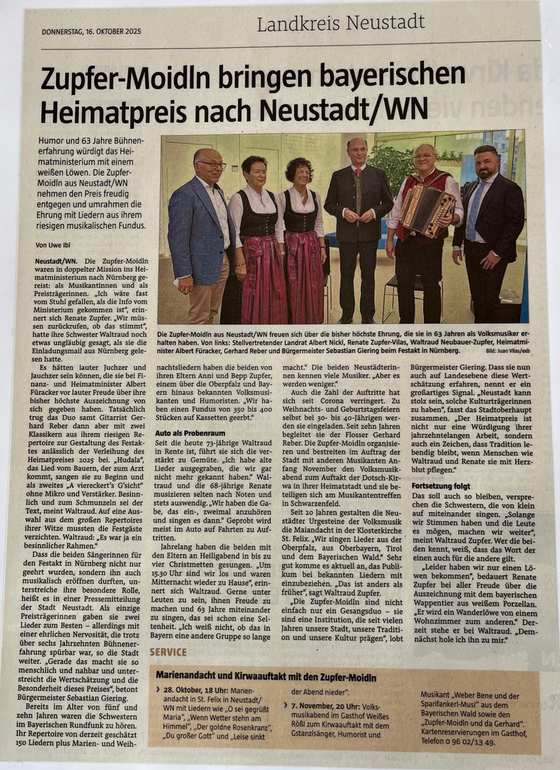 Was für eine Ehre und ein Erlebnis für uns, die Zupfer-Moidln, den Heimatpreis Bayern 2025 aus den Händen von Herrn Staatsminister Albert Füracker und Herrn Staatssekretär Martin Schöffel zu bekommen.