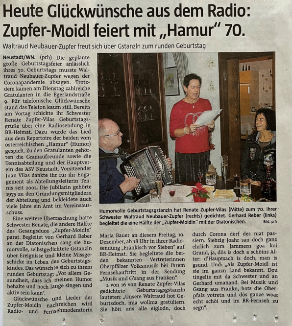 Am Sonntag, 5. Juli 2020 sind wir ab 18.30 Uhr wieder auf OTV beim Volksmusik-Stammtisch zu sehen und zu hören. Gesendet werden die schönsten Lieder aus drei Aufzeichungen in der nördlichen Oberpfalz, nämlich aus Altenstadt und Neustadt a.d. Waldnaab (da waren wir, die Zupfer-Moidln und da Gerhard dabei) sowie aus Weiden.